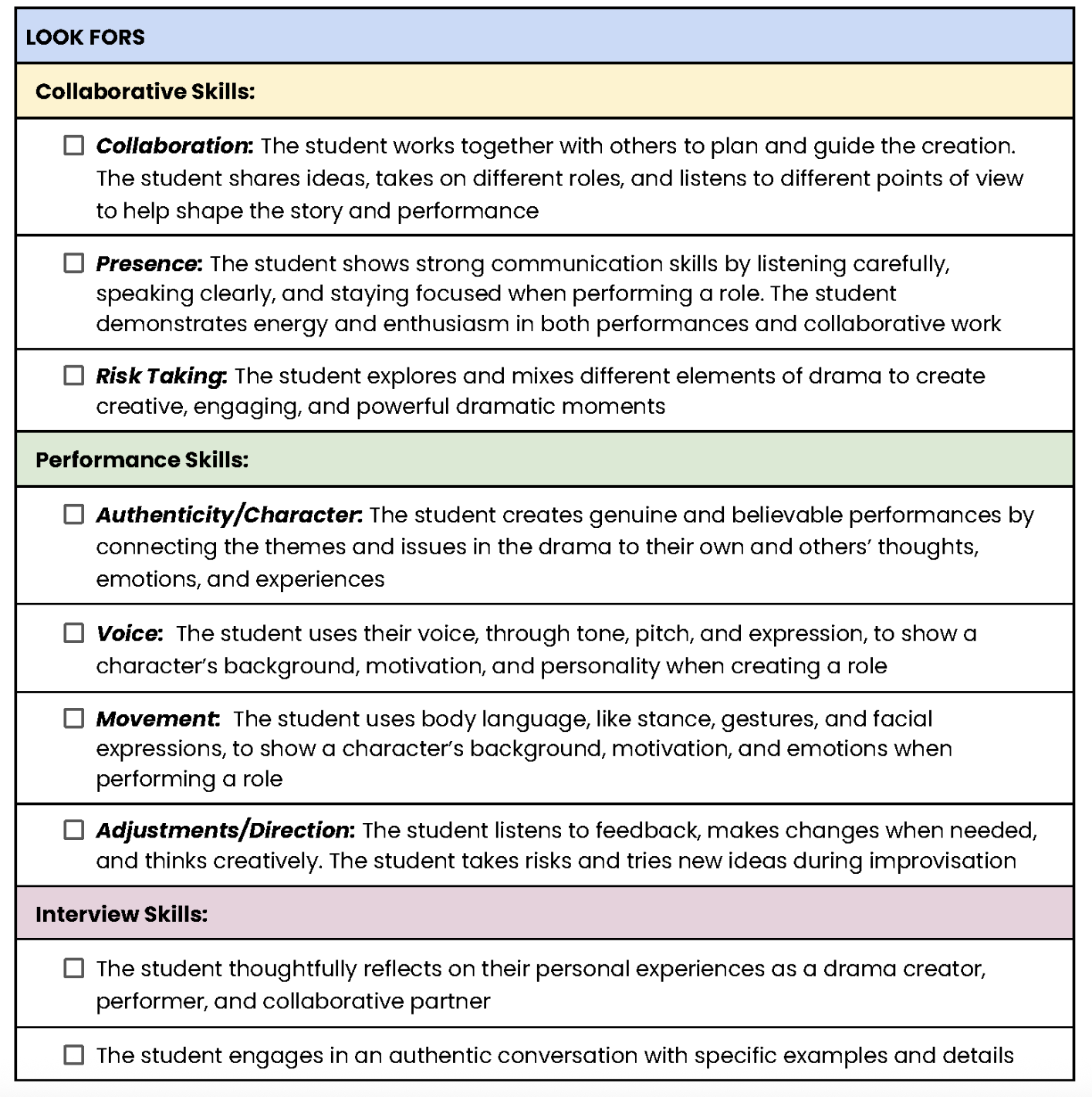 Arts West Drama Audition Success Criteria: