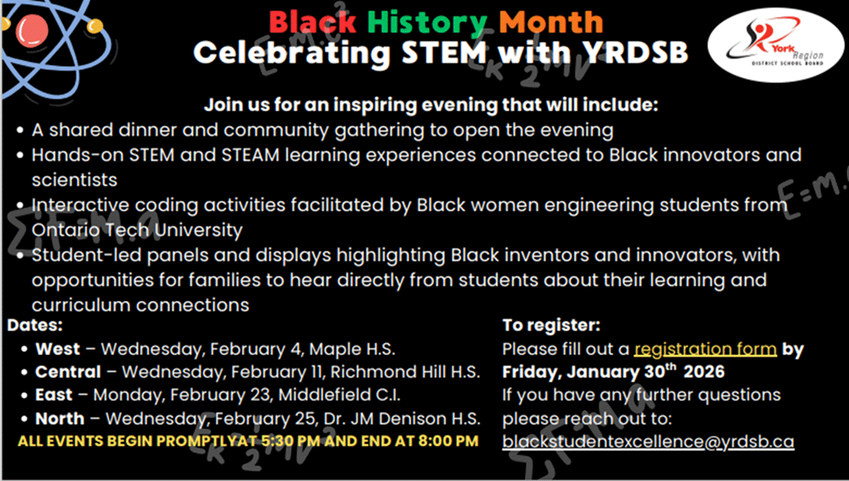 These events are open to everyone, not only Black‑identifying students All events run from 5:30 PM to 8:00 PM. Registration Please encourage families to complete the registration form by Friday, January 30, 2026. |