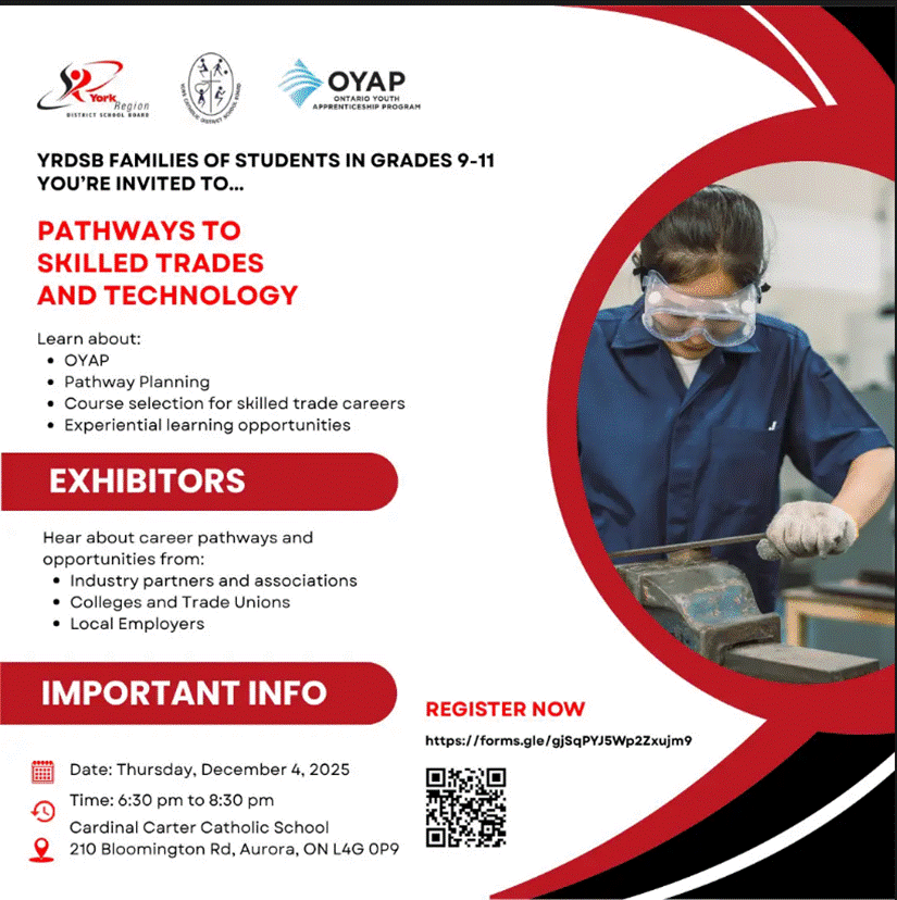 For the 2025-2026 school year, the course withdrawal date (Full Disclosure Date) will be at least 5 instructional days from the last possible date the mid-semester report is issued. The Full Disclosure date for Grade 11 and Grade 12 courses is Friday, November 28, 2025. If a student withdraws from a Grade 11 or 12 course on or prior to November 28th, then the course and mark will not be recorded on the Ontario Student Transcript. If a student withdraws from a Grade 11 or 12 course after the Full Disclosure date, a withdrawal (W) is entered in the credit column, and the student’s mark in the course at the time of withdrawal will be recorded as a percentage in the achievement column of the transcript. NOVEMBER 27 IS THE DEADLINE TO SUBMIT PAPERWORK TO DROP A COURSE. ** Please note…if you are applying to college or university this year, you need to drop the course by November 13 … PRIOR to the transmission of marks to OCAS and OUAC. See communication regarding this in another post. |