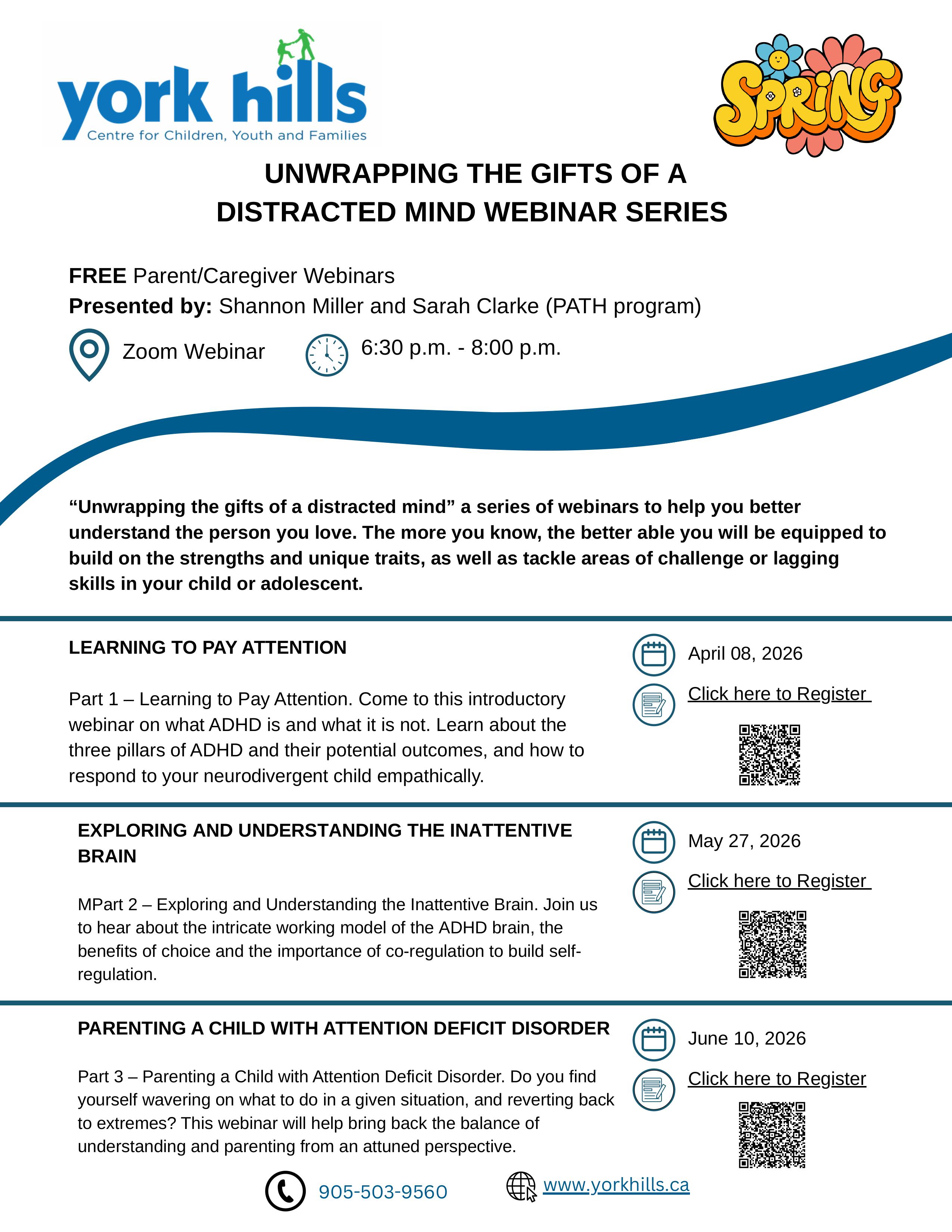 - ADHD Webinar Series - Unwrapping the gifts of a distracted mind Webinar Series - See attached flyer
