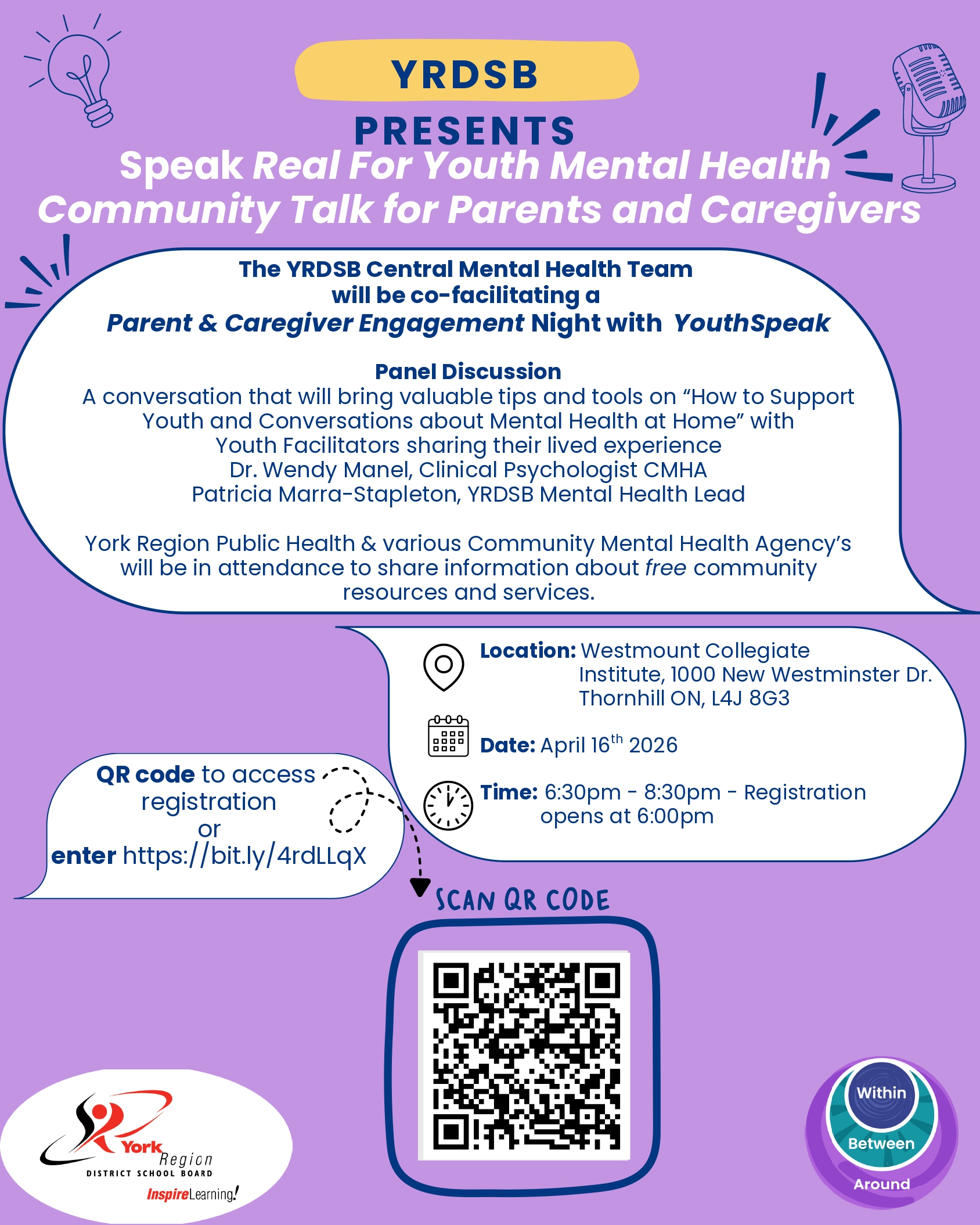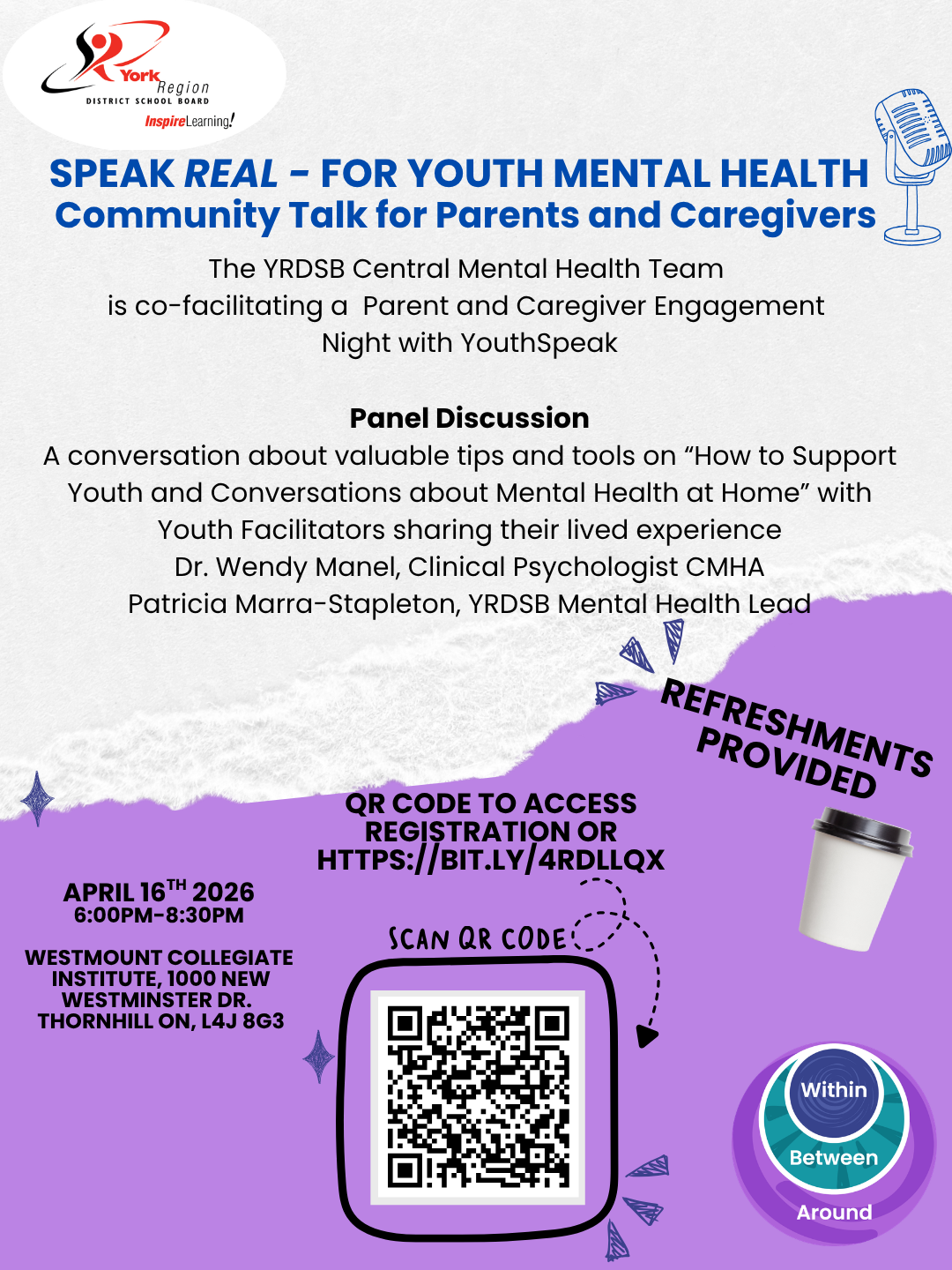 Topic: Panel Discussion A conversation that will bring valuable tips and tools on “How to Support Youth and Conversations about Mental Health at Home” with Youth Facilitators sharing their lived experience as well as Dr. Wendy Manel, Clinical Psychologist CMHA and Patricia Marra-Stapleton, YRDSB Mental Health Lead. Audience questions will be encouraged.